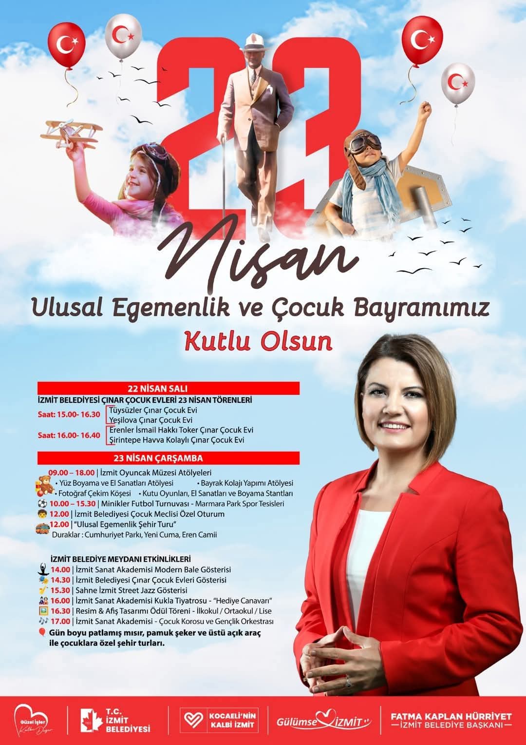 Mustafa Kemal Atatürk’ün dünya çocuklarına armağan ettiği 23 Nisan Ulusal Egemenlik ve Çocuk Bayramı, İzmit Belediyesinin katkılarıyla kent genelinde büyük bir heyecan ve coşkuyla kutlanacak. Tüm kenti saracak bayram havası, birbirinden renkli etkinliklerle dolu dolu bir şölene dönüşecek.