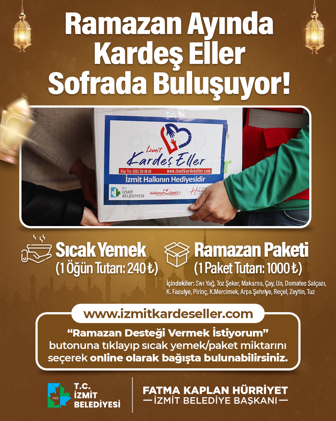İzmit Belediyesi, Ramazan’da ihtiyaç sahipleri için gıda kolisi ve sıcak yemek desteğini başlatırken, hayırseverleri bağış portalı üzerinden dayanışmaya davet ediyor